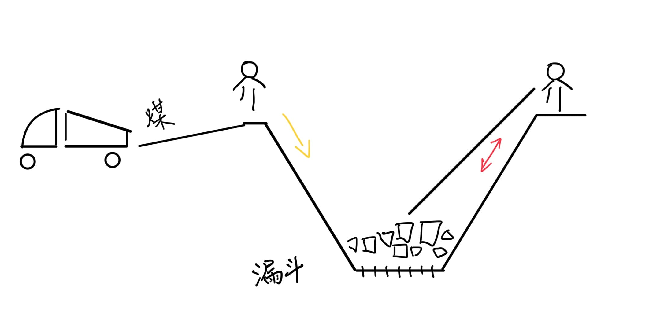 我当时的工资是25 元/天,你没看错。负责的工作是:在煤炭倾倒后,立刻冲到大漏斗中央,把明显不是煤的石块挑出来,并把过大的煤块敲碎,确保它们能顺利落下,从而不阻塞下一批煤。我画了个简单的示意图帮助理解。